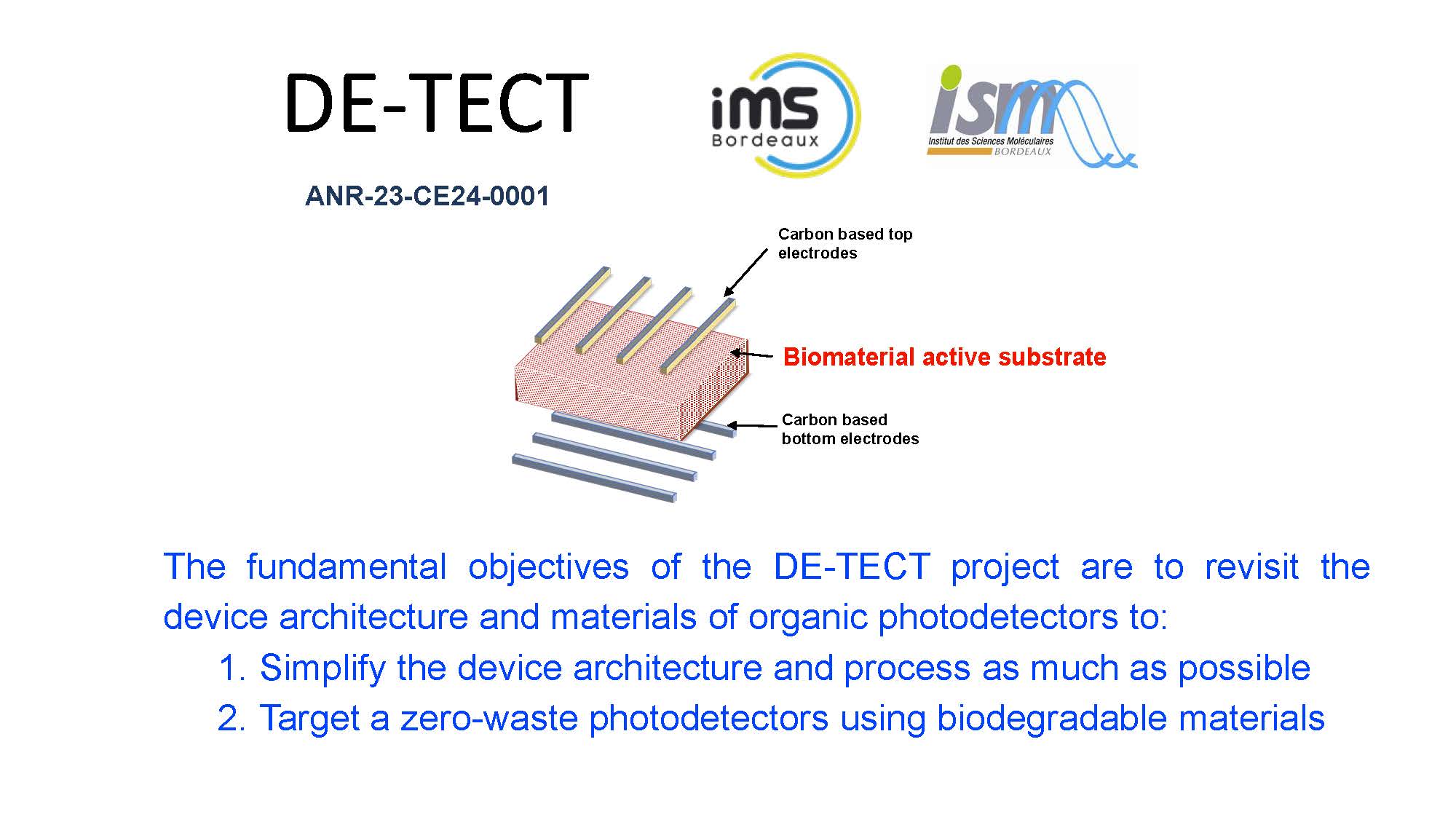 The DE-TECT project develops sustainable photodetectors using bio-sourced, biodegradable materials and printing methods. It redefines materials, design, and architecture to meet strict environmental constraints. A capacitive detection approach with an...