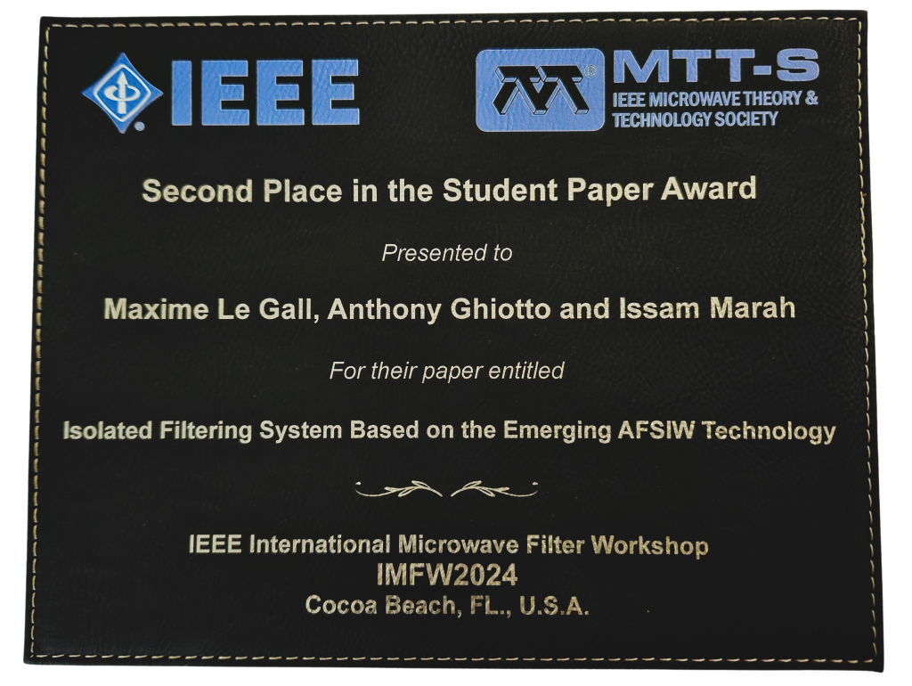 Congratulations to Maxime Le Gall, doctoral student from the IMS laboratory in CIFRE thesis with Exens Solution. He has just won second place in the student competition at the IEEE International Microwave Filter Workshop Conference for his paper entitled: “Isolated Filtering System Based on the Emerging AFSIW Technology.”