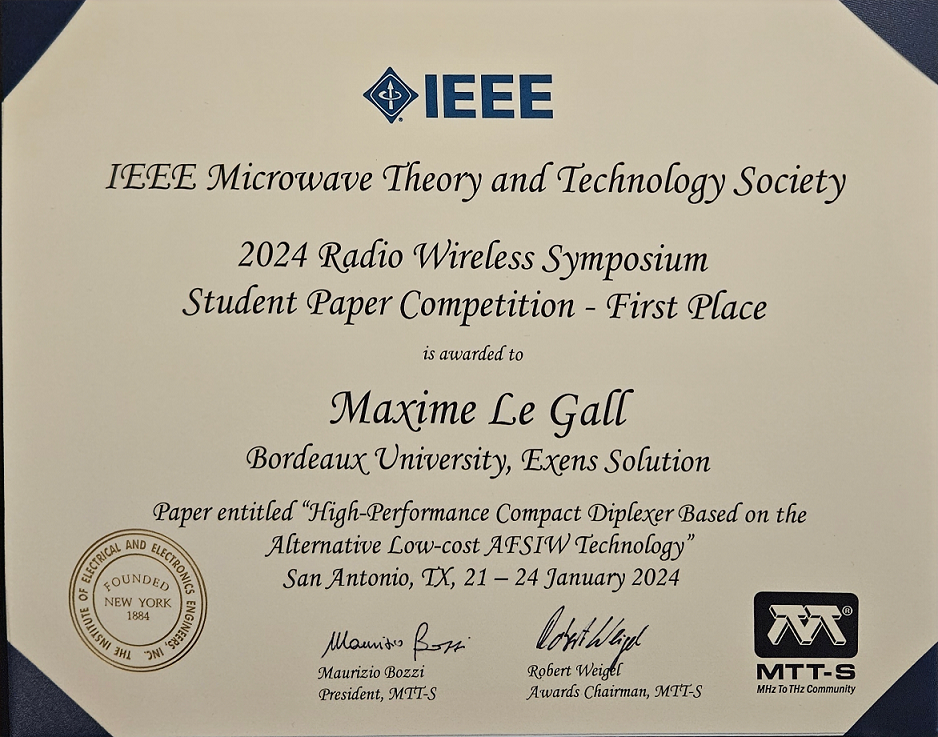 Congratulations to Maxime Le Gall, doctoral student from the IMS laboratory, for his “Best Student Paper” prize won during Radio Wireless Week 2024 in San Antonio, USA. Maxime is working on the development of the new AFSIW technology invented in the laboratory and its application in the design of satellites for New Space as part of a CIFRE thesis with the Gironde company Exens Solutions.