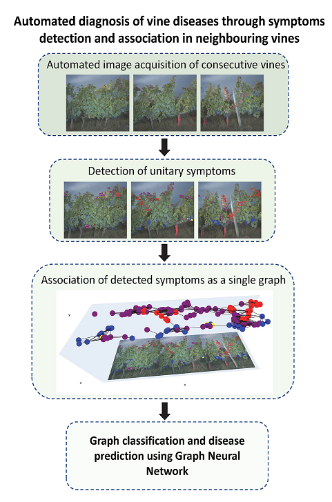 This research focuses on the automated diagnosis of grapevine diseases, specifically grapevine yellows (Flavescence dorée) and grapevine trunk diseases (Eutypa and Botryosphaeria diebacks), using RGB images acquired in proximal sensing and deep learning algorithms. To enhance the accuracy of the literature method (the use of Convolutional Neural Networks), innovative two-step methodologies are developped. These involve individual symptom detection and final diagnosis based on symptom association, using either a Random Forest classifier or Graph Neural Networks. The latter demonstrates superior effectiveness in distinguishing among diseases. Tests conducted on whole-block acquisitions highlight the advantages of these two-step methodologies, emphasizing the consideration of surrounding vines and both sides of the vines during automated diagnosis.