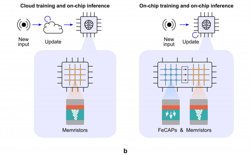 Learning-capable edge artificial intelligence (AI) systems require both inference and learning capabilities combined with energy efficiency. No current memory technology fully meets these needs. Memristor arrays are well-suited for AI inference but have limited endurance and high programming energy. Ferroelectric capacitors (FeCAPs) are good for learning but have data-destructive reads, making them unsuitable for inference. The same hafnium-based device can be optimized to function either as a FeCAP or as a memristor, depending on its operating conditions.
