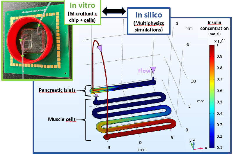 In this thesis, we propose a methodology to design a MOoC deciphering islets to muscles interactions in blood glucose regulation. The MOoC objectives were to: (i) attain physiological insulin concentration secreted by islets in response to physiological glucose elevation, (ii) that induces a measurable glucose uptake by the muscle cells, (iii) monitor online relevant parameters. To that end, the investigations were conducted with an interdisciplinary approach, using and confronting results from both in vitro biological experiments and in silico modelling of biology and physics.