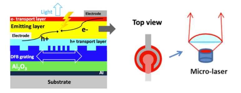 Electrically pumped organic lasers (EPOL) could be easily integrated into other printable, flexible and disposable optoelectronic systems for applications in spectroscopy, biology and health, or for displays and sensors. The objective of IDOL is to develop these promising light sources, which is an important challenge in organic electronics. The project consortium is composed of engineers and researchers in optics, synthetic chemists, physicists and electronic engineers. Organic light emitting transistors will be used to achieve high current density and to minimize light/electrode losses. Optical simulations and advanced characterizations will guide the development of the devices step by step. New electron transport and light emitting molecules will be synthesized to overcome the technological hurdles from a material point of view.